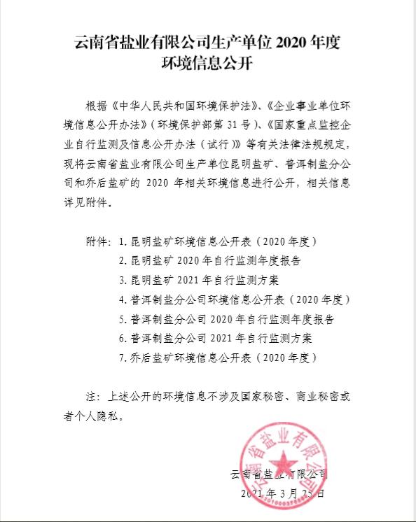 云南省鹽業(yè)有限公司生產(chǎn)單位2020年度環(huán)境信息公開