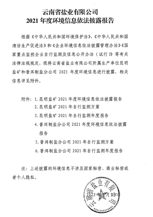 云南省鹽業(yè)有限公司2021年度環(huán)境信息依法披露報告