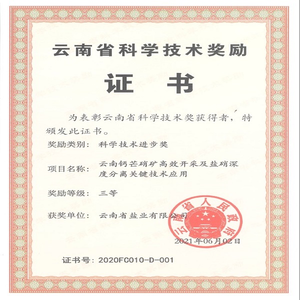 研發(fā)中心 報道 2021年1118日,公司“云南鈣芒硝礦高效開采及鹽硝深度分離關(guān)鍵技術(shù)應(yīng)用”成果喜獲云南省2020年度科學(xué)技術(shù)進步獎三等獎。