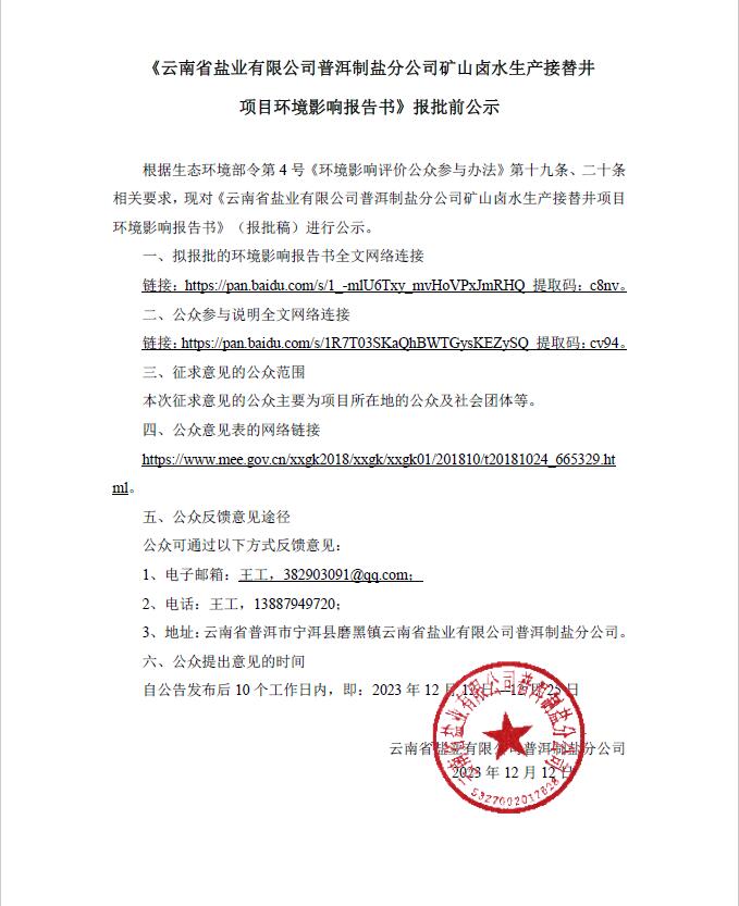 普洱制鹽接替井項目環(huán)境影響報批前公示