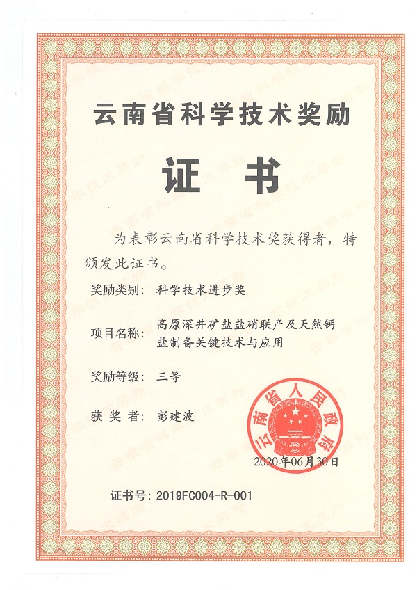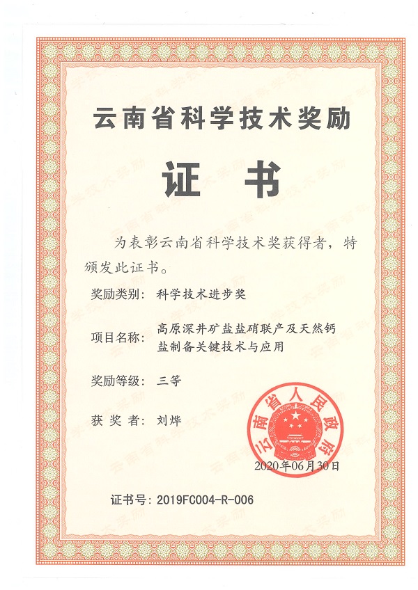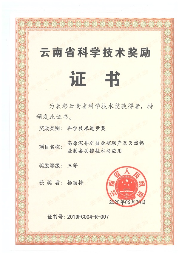 經專家評審、省科學技術獎勵委員會審定和省科技廳審核,云南省人民政府批準,2020年6月,云南鹽業(yè)“高原深井礦鹽鹽硝聯(lián)產及天然鈣鹽制備關鍵技術與應用”成果榮獲云南省科學技術進步獎三等獎。