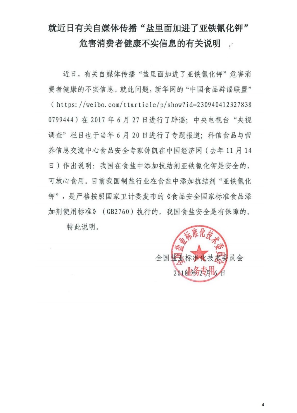 就近日有關(guān)自媒體傳播"鹽里面加了亞鐵氰化鉀"危害消費(fèi)者健康不實(shí)信息的有關(guān)說明